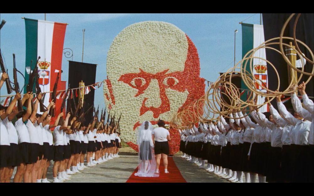 The fascist rally arrives almost halfway through the film, but when it does, we recognize the faces: the teacher, the priest, the cop, the neighbor. They’re the townspeople we’ve been laughing at and living with. The parade is full of pageantry and spectacle, but it’s all hollow. A young boy fantasizes about marrying a giant flower-headed Mussolini. Later, the town rows out at night to salute a fascist ocean liner that turns out to be a painted cutout on a studio set. The whole thing is performance.